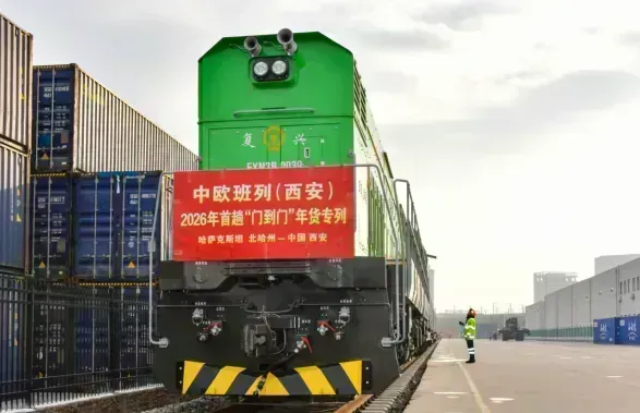 “滴——”上午9时,伴随着响亮的汽笛声,中欧班列(西安)2026年首趟“门到门”年货专列稳稳停靠在西安爱菊集团园区专用线上。这趟班列从哈萨克斯坦北哈州西安爱菊集团的海外工厂专用线发出,抵达西安国际港站后无须换装汽车,经铁路专用线直接“送货上门”,实现了“厂门到厂门”的无缝衔接。