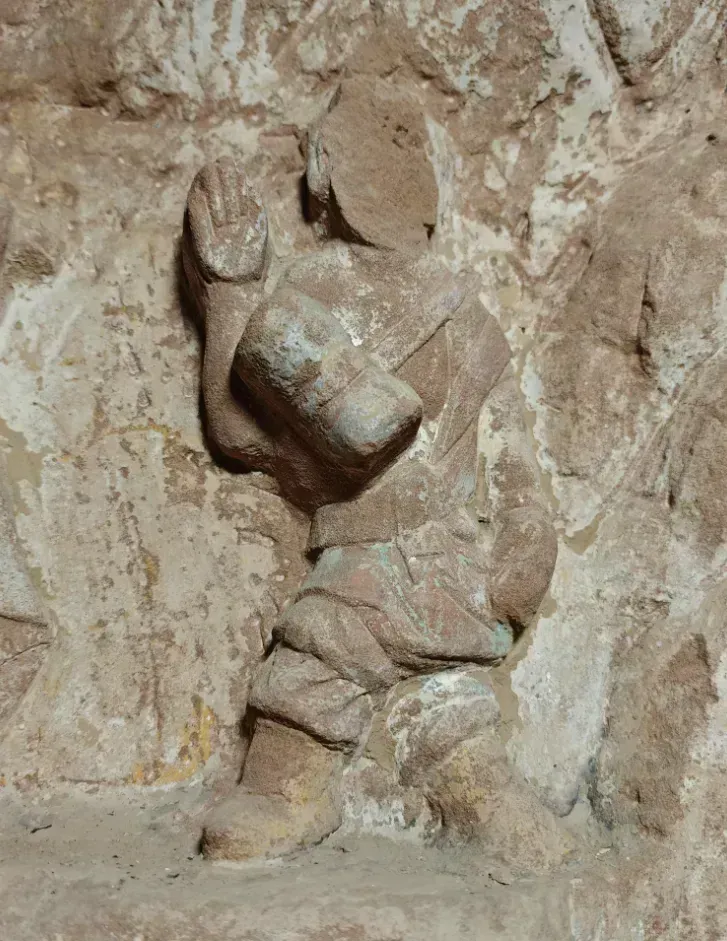 本次发现的石雕造像为红砂石质,由南向北依次排列:第一人为直立状,头束高髻,面部残损,上身着袒右臂长衣,下身穿紧腿短裤,胸腰间斜挂一束腰小鼓,右臂上举、五指并拢、手心向外,左臂自然下垂、五指并拢、手心向内,似作拍鼓状;第二人双手握长笛,作吹奏状;第三人双臂前伸高举,双手紧握三角形板状乐器,似作拍击状;第四人上身穿长袖衣,下身着紧腿短裤,弯腰伸臂屈腿作舞蹈状。除该组造像外,石窟西壁、南壁大门西侧中部还各发现一组着长袍拍镲、击鼓人物造像,所有造像均雕刻细腻精致,人物形态各异、栩栩如生。
