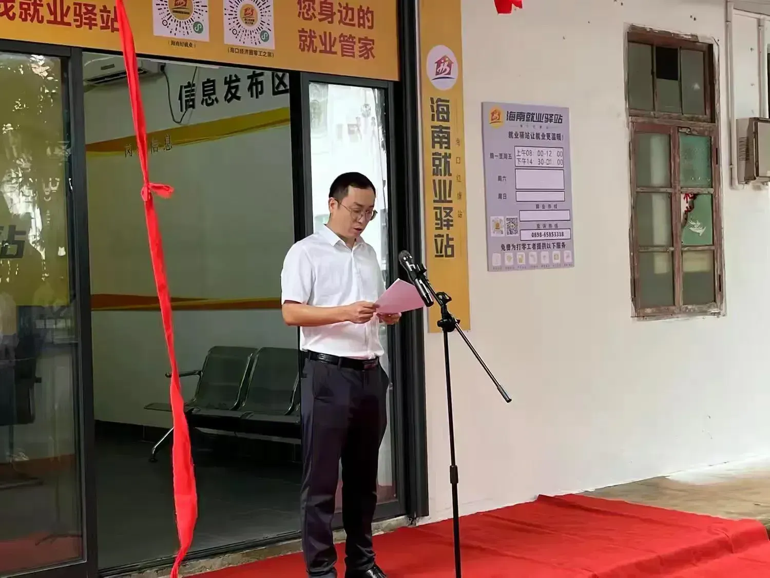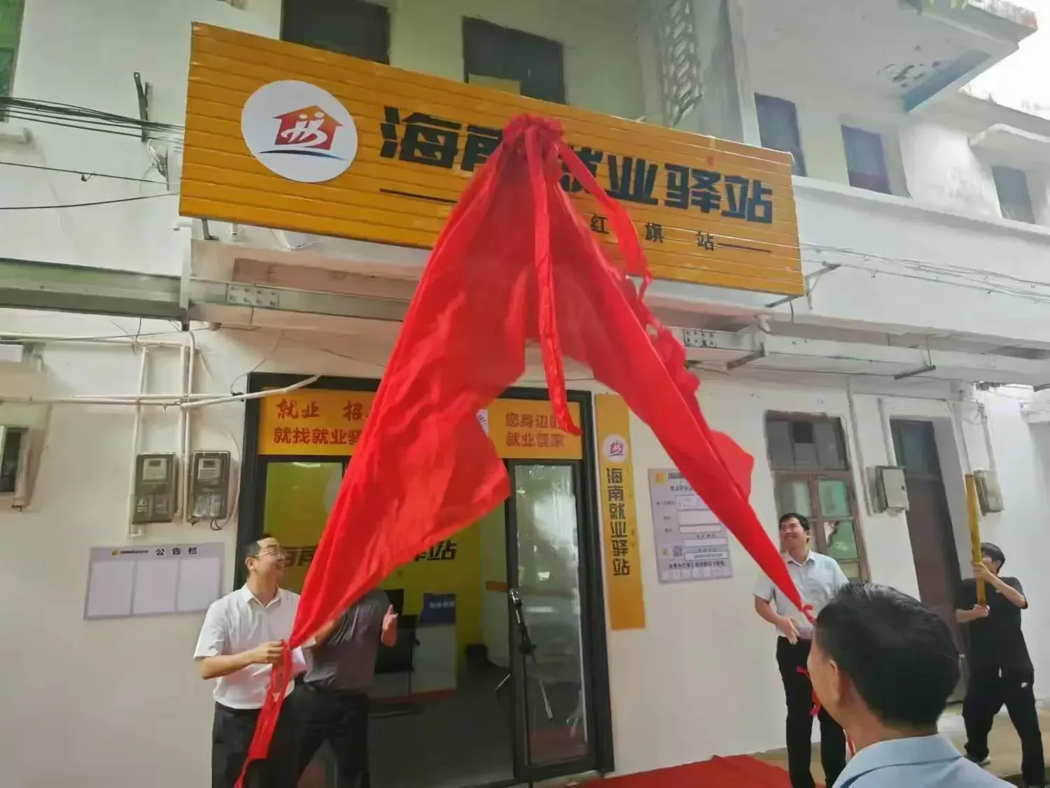 琼山区人力资源和社会保障局副局长陈怡充;红旗镇党委副书记黄银亮共同为海南就业驿站海口红旗站进行揭牌。
