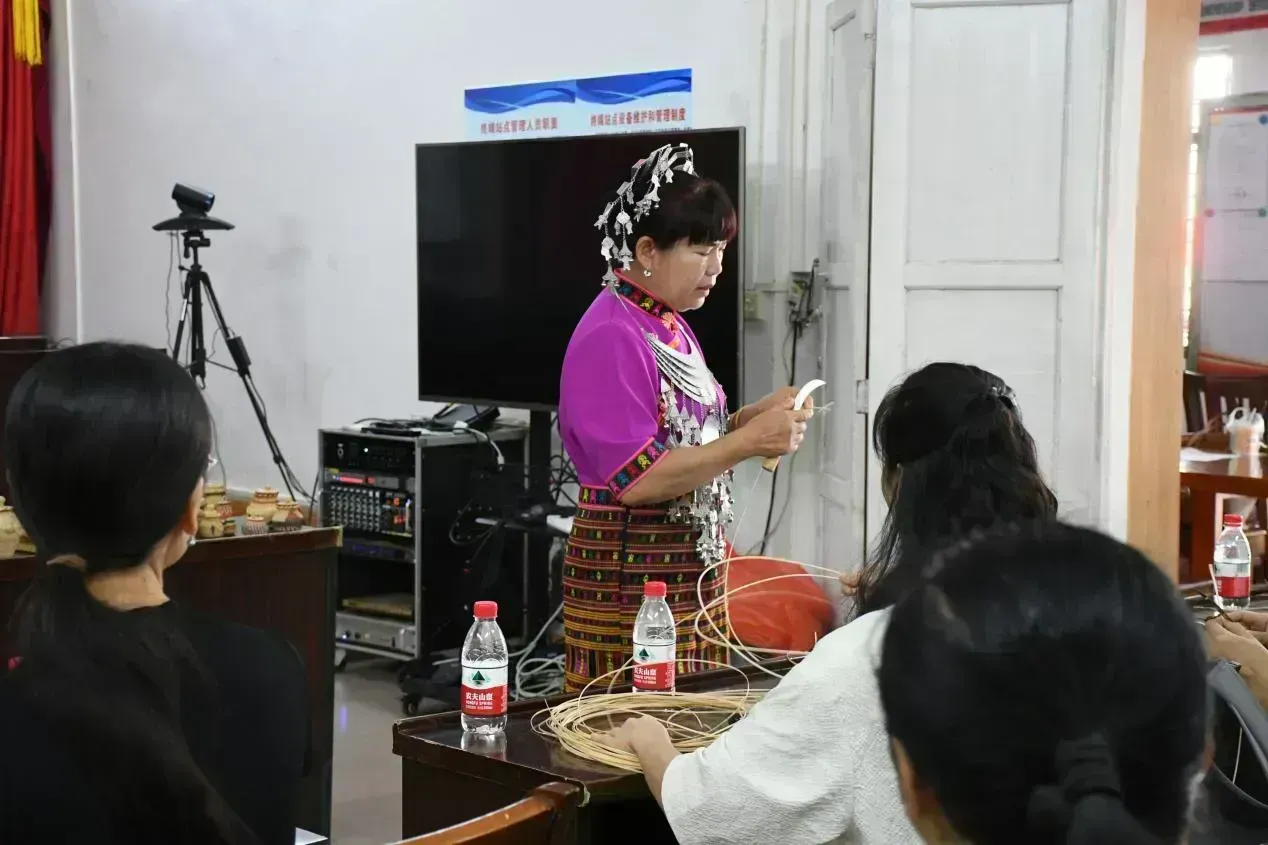 培训会上,邀请县级藤编技艺传承人谭跃芳和李凤玲两位老师,为参训学员带来了精彩绝伦的技艺展示和深入浅出的教学。授课老师从藤编材料的选取、加工到各种编织技法的应用,进行了系统而详细的讲解,并亲自指导学员们进行实践操作。