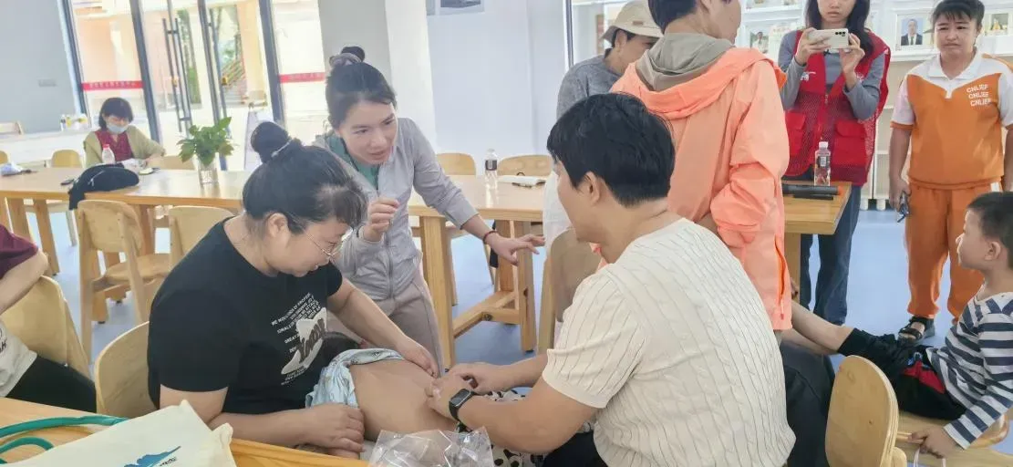 在互动实操环节,郑冬梅老师重点演示了多种适合家庭操作的小儿推拿手法,包括摩腹、捏脊、工字搓背、头面四大穴位按摩等。家长们一边认真聆听,一边在孩子身上轻柔练习,老师逐一指导纠正手法,确保大家学得会、用得上。
