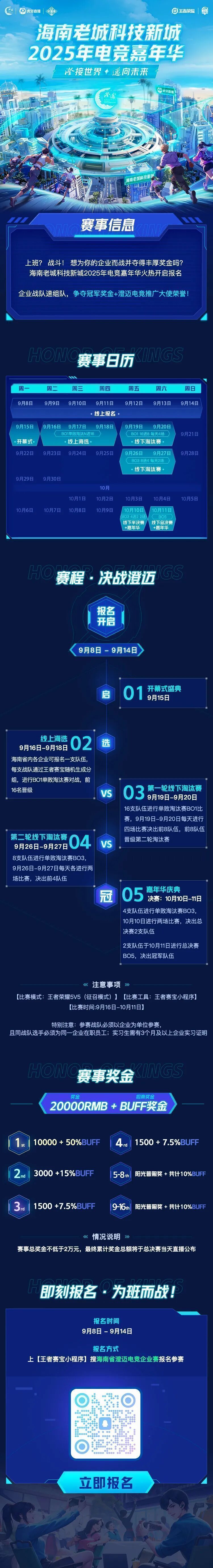 赛事将于9月15日正式开幕,持续至10月11日,为期近一个月的赛程将汇聚海南各企业的王者荣耀精英选手,展开线上线下激烈角逐。