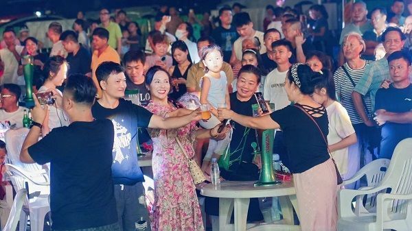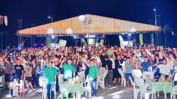 当晚的万宁市文化体育广场,处处透着热闹的烟火气:舞台电子屏滚动播放着青岛啤酒宣传片;广场内,绿色与蓝色交织的遮阳棚下,美食摊、啤酒售卖区已排起长队,重庆酸辣粉的红油香、碳烤大肉串的焦香与青岛啤酒的清爽气息交织,引得提前到场的市民游客频频驻足。