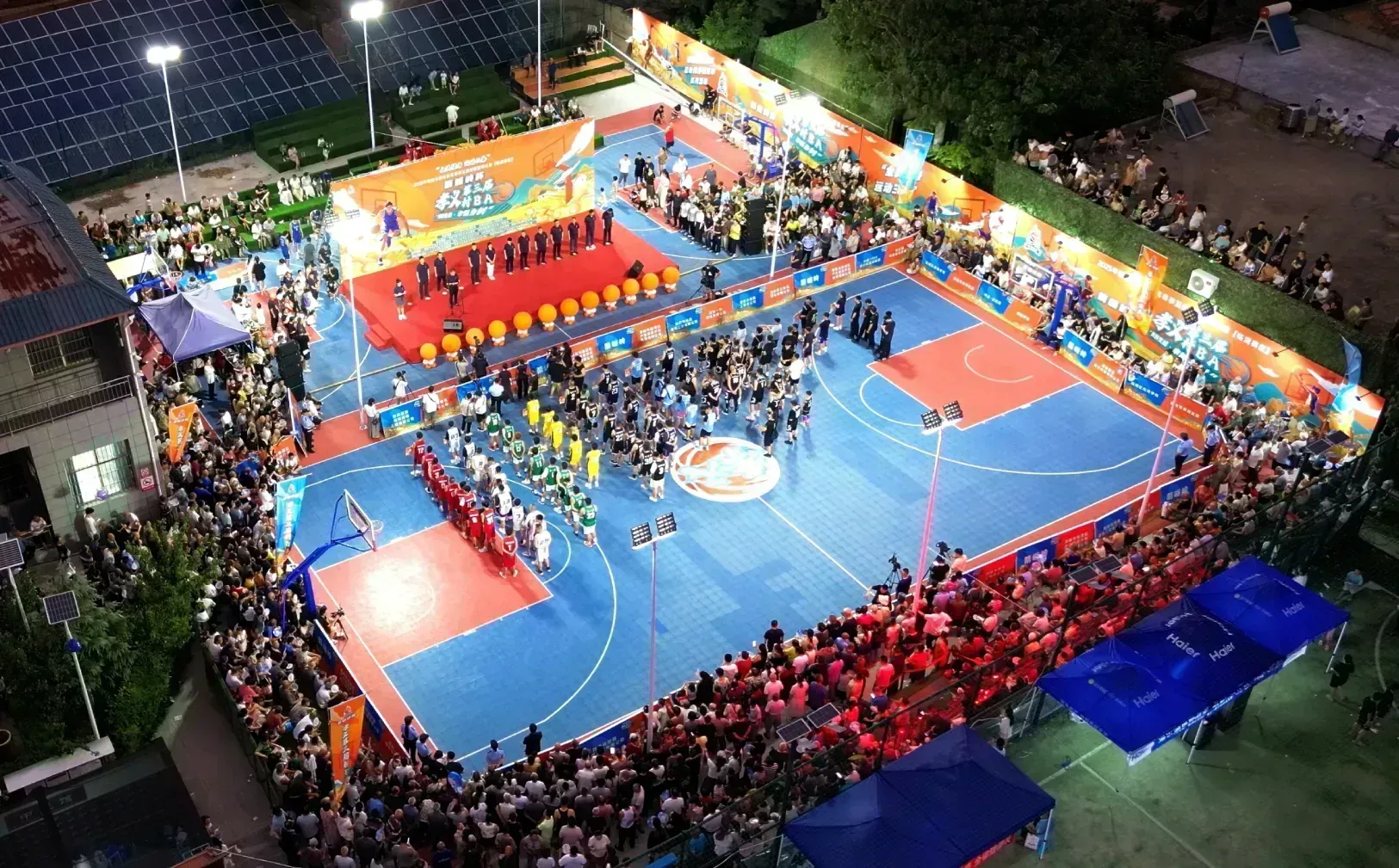 傍晚18:50,孝丰村党群服务中心的球场已座无虚席,暖场表演中,秦腔唱段的高亢唱腔与《黄河源头》的嘹亮歌声交替响起,本土艺术家与村民演员同台献艺,将关中民俗风情展现得淋漓尽致。开幕式上,运动员、裁判员代表队迈着整齐的步伐入场,伴随着雄壮的国歌声,全场观众起立致敬,乡村球场瞬间充满庄严与热血交织的氛围。
