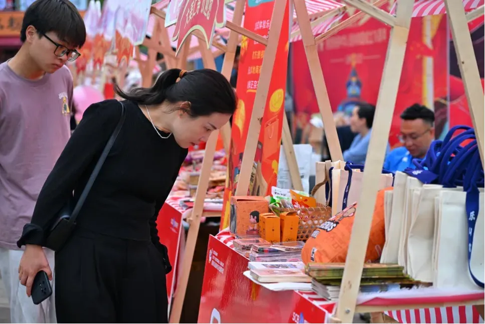 在赛事嘉年华区域,眉山、乐山两地的特产展销摊位人气火爆,乐山甜皮鸭、钵钵鸡调料,峨眉山茶,眉山东坡肘子、柑橘、仁寿芝麻糕等特色好物整齐陈列,吸引了游客纷纷驻足品尝、购买。