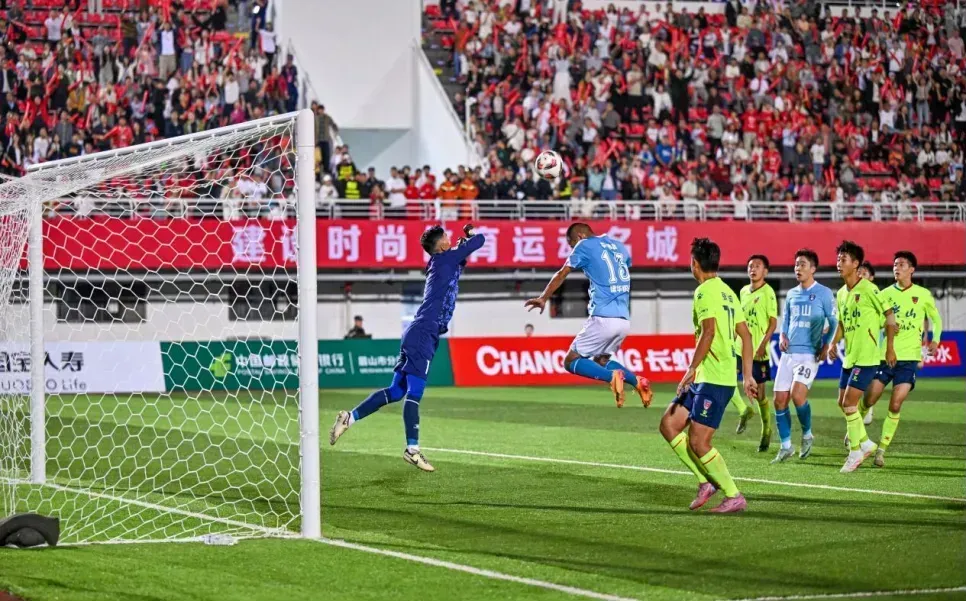 场上球员的每一个动作都牵动看台上所有球迷的心。眉山队球员带球突破中场,红色阵营的呐喊声瞬间拔高分贝,有人激动起身,跟着球员的跑动轨迹挥舞手臂。每当两队球员在禁区前激烈拼抢,或守门员飞身扑出关键一球,整个赛场的声浪就会瞬间再掀高峰。下半场,比赛更趋激烈。乐山队率先打破僵局,赢得一分,眉山队不甘落后随即加强攻势,扳平了局面,比赛最终锁定在1:1平局。整场比赛,双方球员在场上都拼尽了全力,赛后又与球迷相互致敬,这样的场景成为了中秋之夜最温情最暖心的画面。