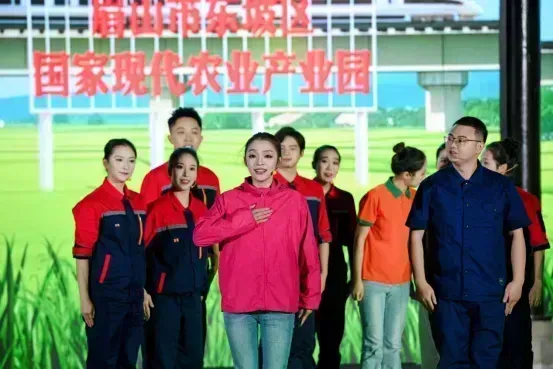 当晚的文艺汇演可谓精彩纷呈,13个由四市群众自编自导自演的优秀节目轮番登场,涵盖舞蹈、村歌表演唱、快板、民俗表演等多种形式,既彰显了地域文化特色,又展现了新时代群众的艺术创造力与精神风貌。仁寿本土舞蹈队带来的开场舞《百姓大舞台》活力四射,每一个动作都透露着精气神儿,饱含着对生活的热爱;村歌《梨花飘香的地方》婉转悠扬,将曹家镇漫山梨花开的美景与乡土风情娓娓道来,引人入胜。成都选送的快板《家中来了洋女婿》以幽默诙谐的笔触,既描绘了“一带一路”倡议下中外互利共赢的合作成果,又展现了城乡融合发展的新面貌,引得现场笑声不断;雅安的舞蹈《欢喜花灯俏生活》舞姿灵动、韵味十足,将传统民俗文化的独特魅力展现得淋漓尽致;乐山的情景表演唱《全家福》温情脉脉,通过生活化的场景演绎,传递出乡村振兴背景下家庭和睦、生活幸福的美好图景。此外,《青神红》《我为永丰加把油》等节目聚焦眉山各区县独特的文化符号与发展成果,引发全场观众的强烈共鸣。最后,全体演员共同演绎的舞蹈《没有天花板的舞台》将现场气氛推向最高潮,生动诠释了“有才你就一起来”的全民参与理念,整场演出掌声雷动、喝彩不断,群众真正成为了舞台上最耀眼的“民星”。