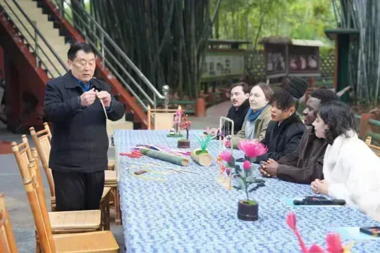 图为青神竹编国家级代表性传承人陈云华向国际友人传授竹编技法