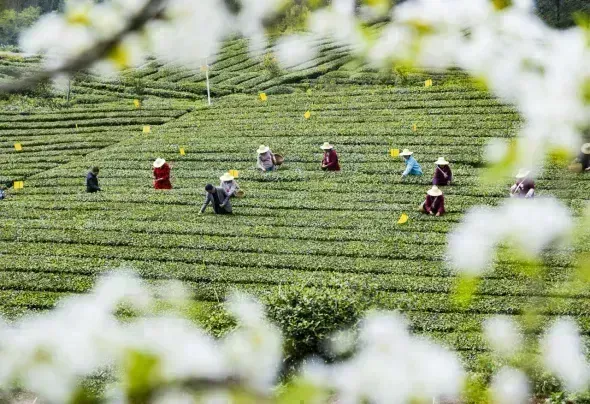 图为秭归茶园里茶农采茶忙