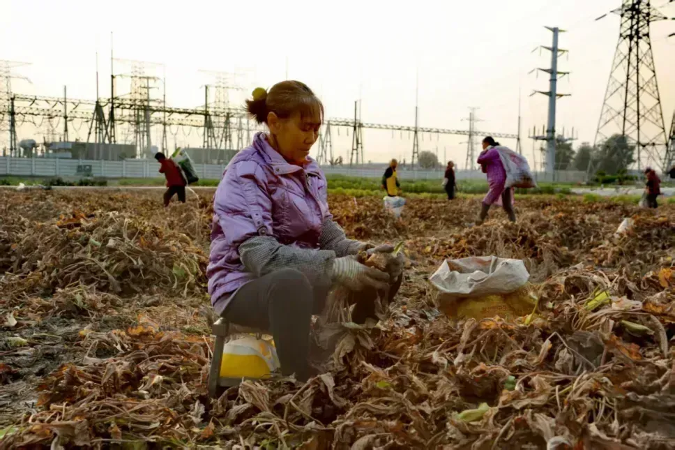 图为采收工人正挖掘成熟的泽泻果实