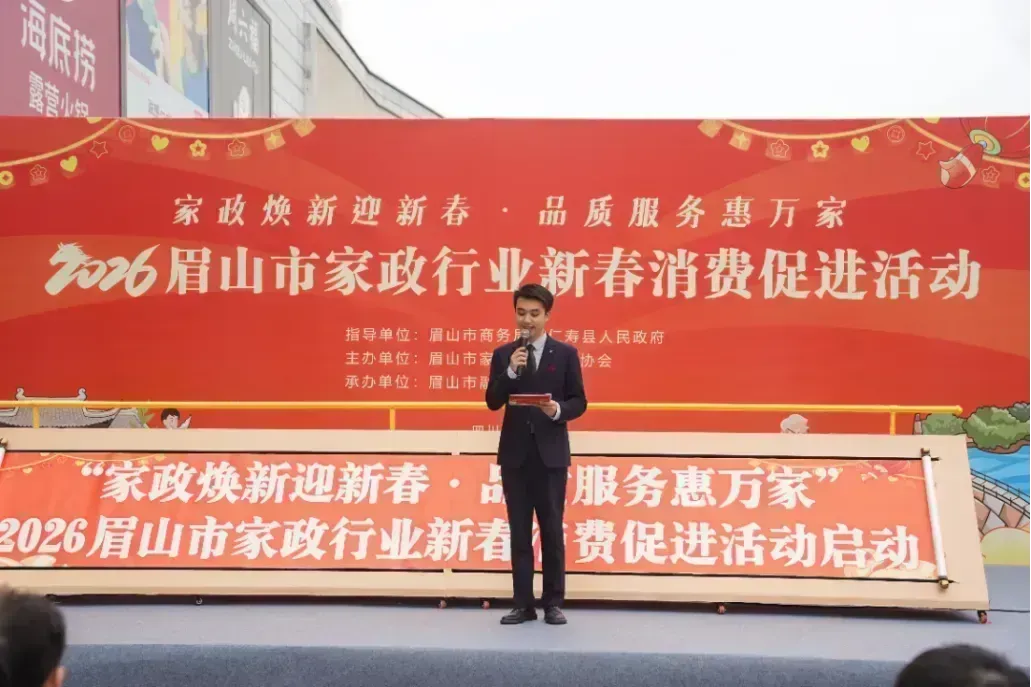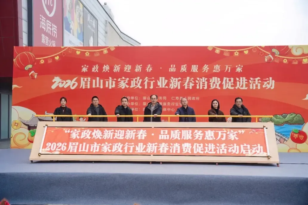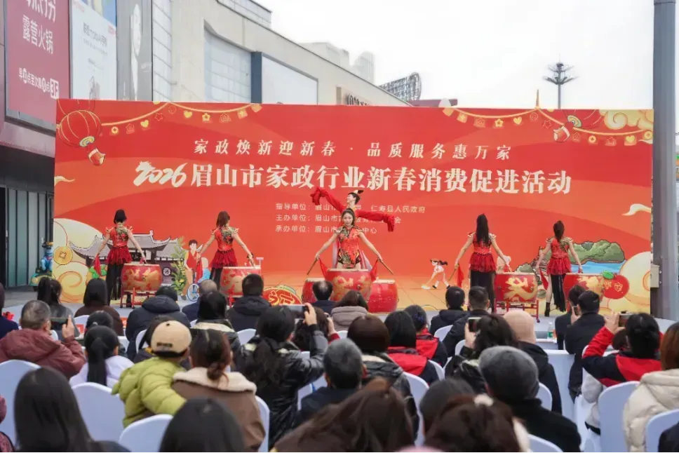 2026年2月4日上午,四川省眉山市仁寿万达广场鼓声激昂、春意融融,“家政焕新迎新春·品质服务惠万家”——2026眉山市家政行业新春消费促进活动在此正式启动。活动由眉山市商务局、仁寿县人民政府指导,眉山市家政服务行业协会主办,市融媒体中心承办,旨在推动家政服务提质扩容,促进服务消费升级,助力全市“金耀眉州”迎春消费季活动深入开展。