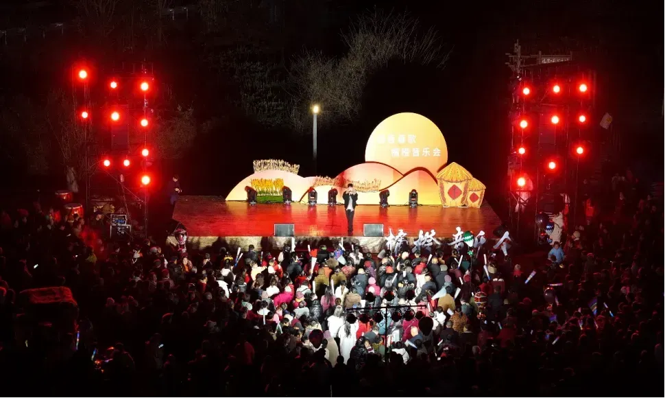 灯亮起后,年味便从丹棱的乡野街巷逐渐发酵。从腊月二十二开始,“橘橙音乐会”走进乡镇,登台的是海选歌手、当地村民,台下站着的,是邻里乡亲、远归的游子,歌声未必专业,却唱进了每个人的心里;“墨乡丹棱·迎春送福”活动在唢呐广场铺开红纸,书法家把春联递到乡亲掌心;年味集市免费烤全羊滋滋作响,锅庄舞的圈子里,素不相识的人拉起手舞起来。