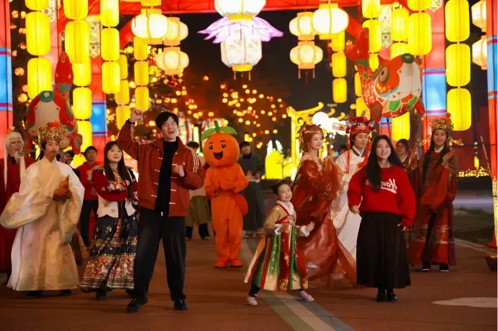 当彩灯点亮沧浪公园,思蒙河畔便化作光影星河。9米高的“橘颂天香”女神温柔垂眸,“马跃迎新春”“马上开花”等灯组次第铺展,将新春祝福洒满公园。12名唢呐艺人乘竹筏破水而来,高亢乐音拉开光影序章;NPC巡游队伍穿行灯海,与游人即兴相逢;游客拿着“橘子币”闯关探秘,千年打铁花炸燃寂静夜空,河灯顺思蒙河蜿蜒而下,烛火与彩灯遥相致意。