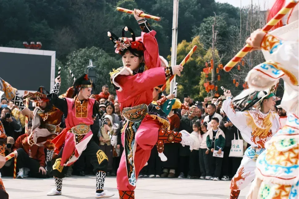 人群中,一位从成都专程赶来的游客李蕾举着手机,镜头追随着翻飞的英歌槌:“之前在短视频里刷到丹棱过年有英歌舞,专门开车带全家人过来玩。能在四川看到正宗的潮汕英歌,过年都变得有仪式感了!”