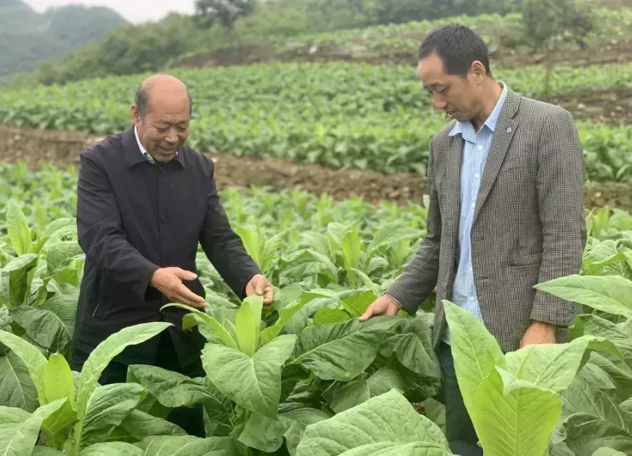 陈分新(左)和张强(右)在检查烟田生长情况摄影 陈岚