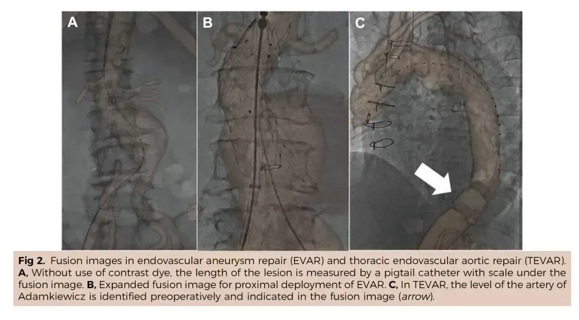 图1 国外报道的DSA术中图像融合技术,融合图像模糊不清,CTA图像为3D重建影像,DSA为2D影像,两者图层之间简单重叠覆盖,清晰度明显受到相互影响
