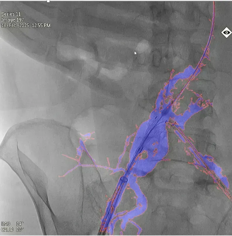 图2 本研究案例,使用10ml造影剂一次造影,实现EVAR术中髂内动脉重建,图中蓝色部分为造影显示的真实血管,红色边框为图像分割结果,融合图像的透明度可调节,与真实血管完全贴合,血管、器械的细节都清晰可见。