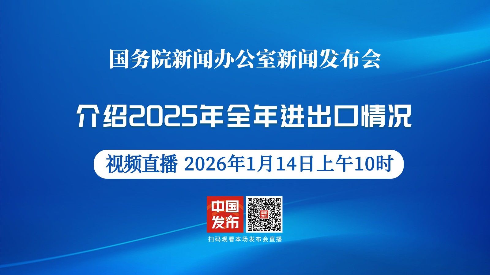国务院新闻办公室将于2026年1月14日(星期三)上午10时举行新闻发布会,请海关总署副署长王军介绍2025年全年进出口情况,并答记者问。