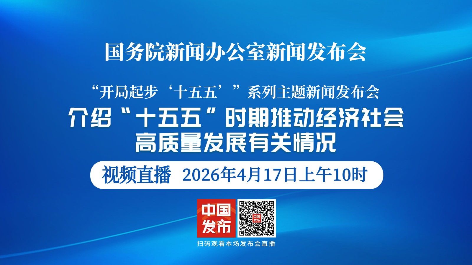 国务院新闻办公室将于2026年4月17日(星期五)上午10时举行“开局起步‘十五五’”系列主题新闻发布会,请国家发展改革委副主任王昌林介绍“十五五”时期推动经济社会高质量发展有关情况,并答记者问。