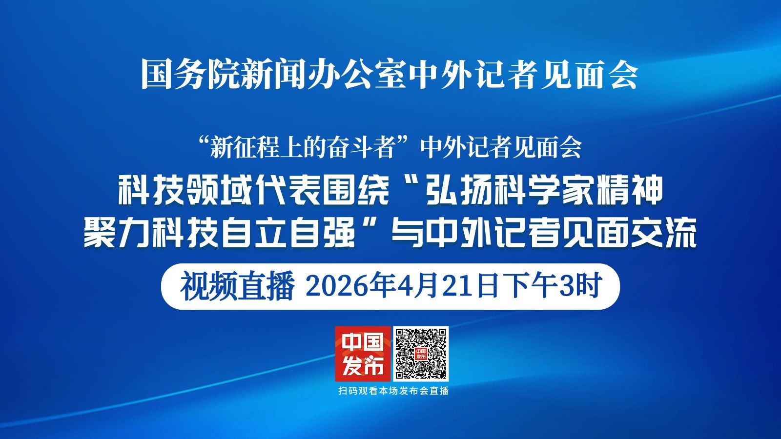 国务院新闻办公室于2026年4月21日(星期二)下午3时举行“新征程上的奋斗者”中外记者见面会,请科技领域代表围绕“弘扬科学家精神聚力科技自立自强”与中外记者见面交流。内蒙古呼伦贝尔草原生态系统国家野外科学观测研究站站长辛晓平,中国中车首席科学家梁建英,中国科学院计算机网络信息中心副主任周园春,清华大学车辆与运载学院副教授徐梁飞,嫦娥六号任务副总设计师王琼,出席本次记者见面会。