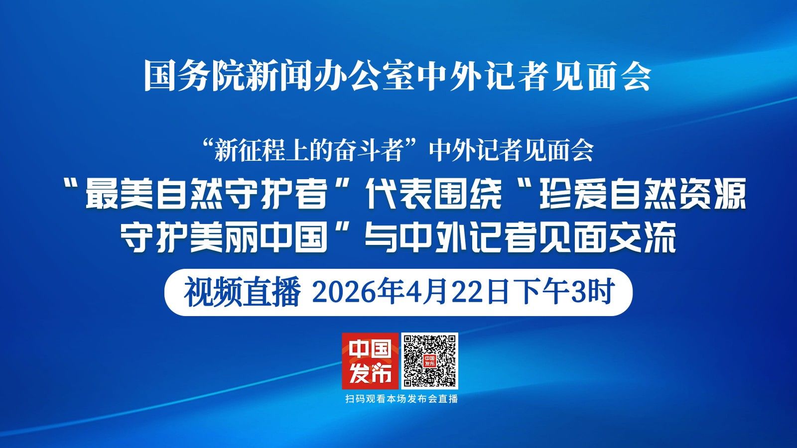 国务院新闻办公室于2026年4月22日(星期三)下午3时举行“新征程上的奋斗者”中外记者见面会,请“最美自然守护者”代表围绕“珍爱自然资源,守护美丽中国”与中外记者见面交流。自然资源部第一大地测量队高级工程师任秀波,中国地质科学院水文地质环境地质研究所研究员王贵玲,浙江省安吉县自然资源和规划局副局长王卫民,北海预报减灾中心海阳海洋站站长姜文凯,上海市崇明东滩自然保护区管理事务中心主任钮栋梁,出席本次记者见面会。