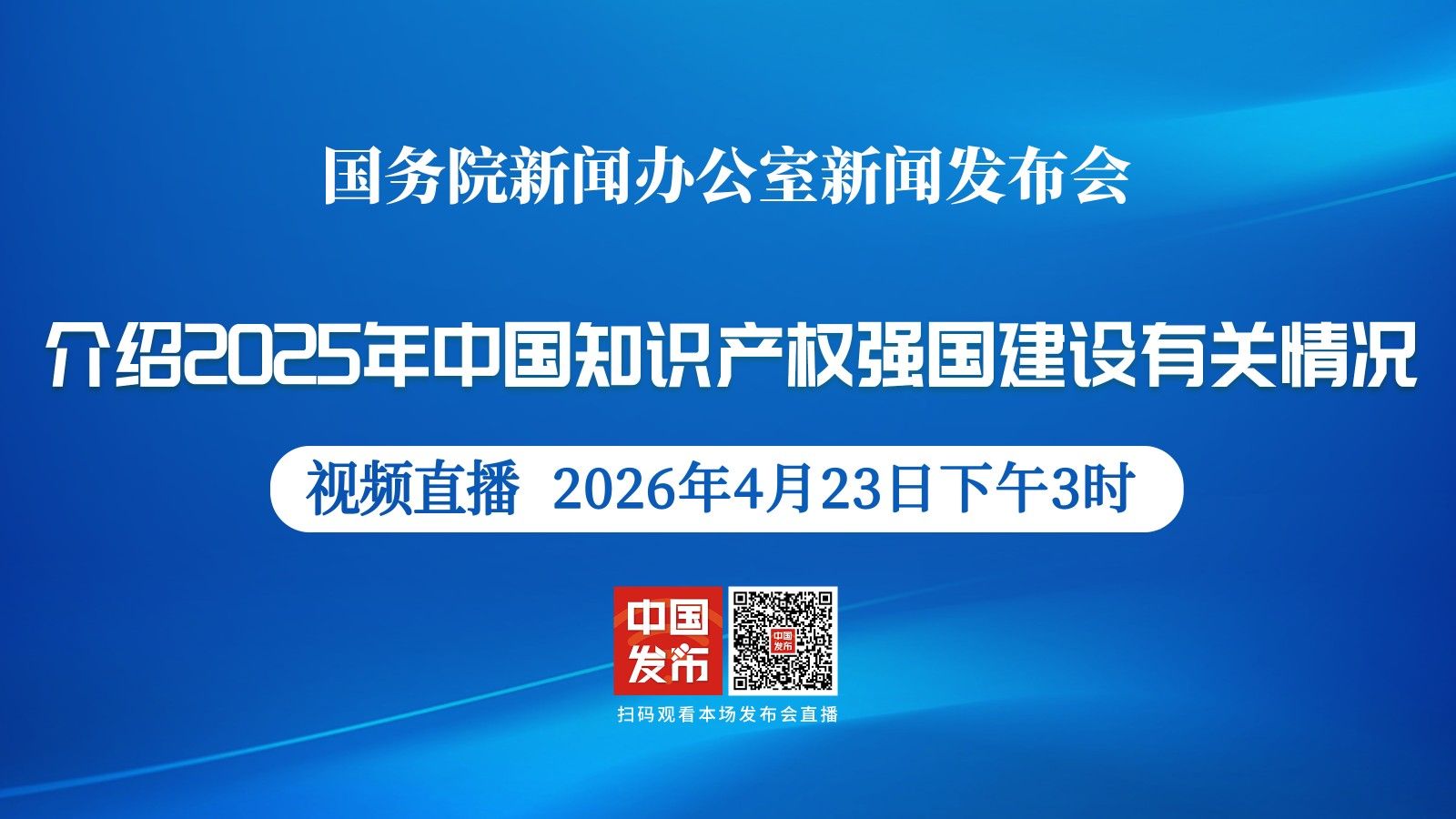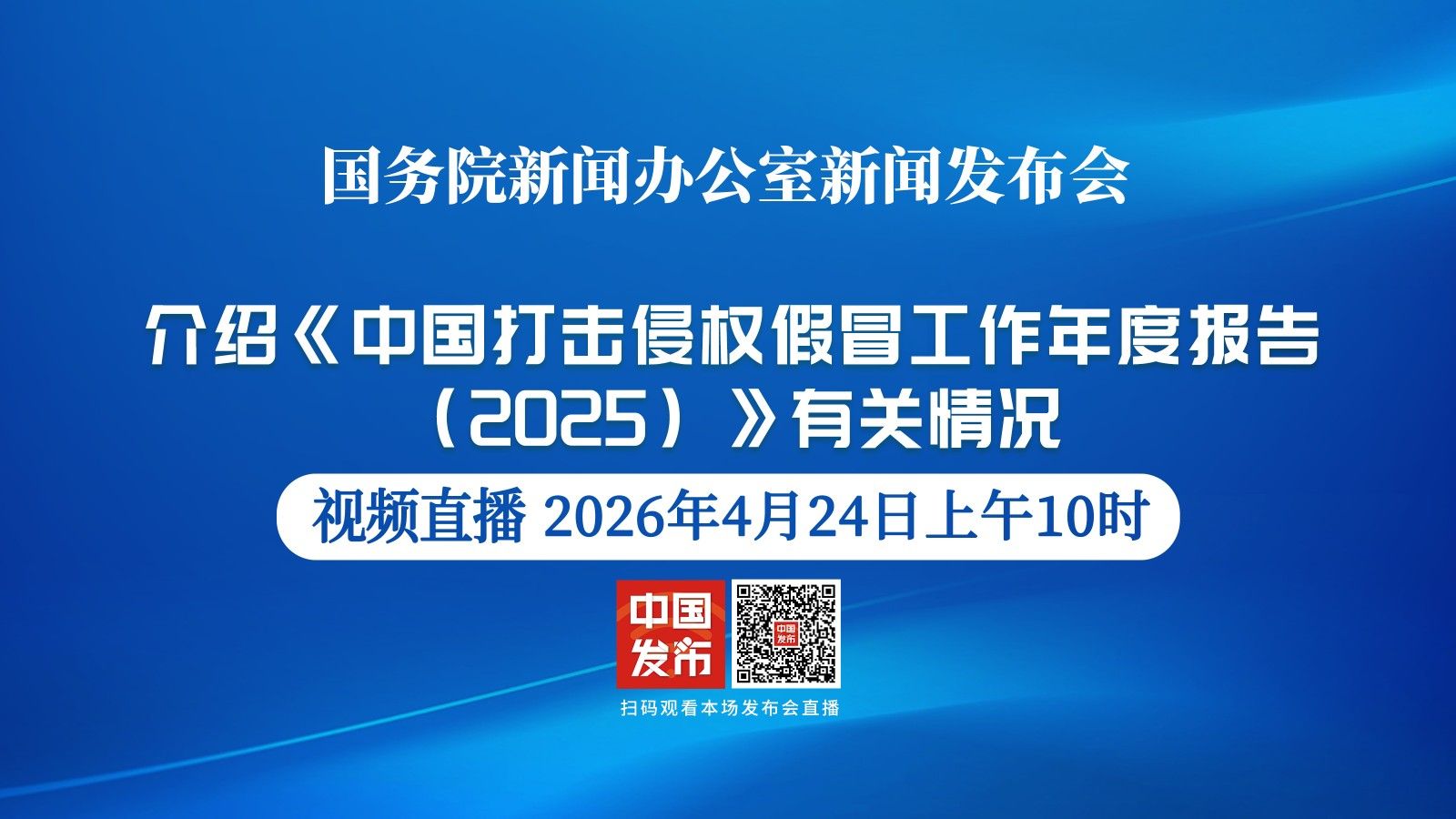 国务院新闻办公室于2026年4月24日(星期五)上午10时举行新闻发布会,请市场监管总局副局长白清元介绍《中国打击侵权假冒工作年度报告(2025)》有关情况,并答记者问。