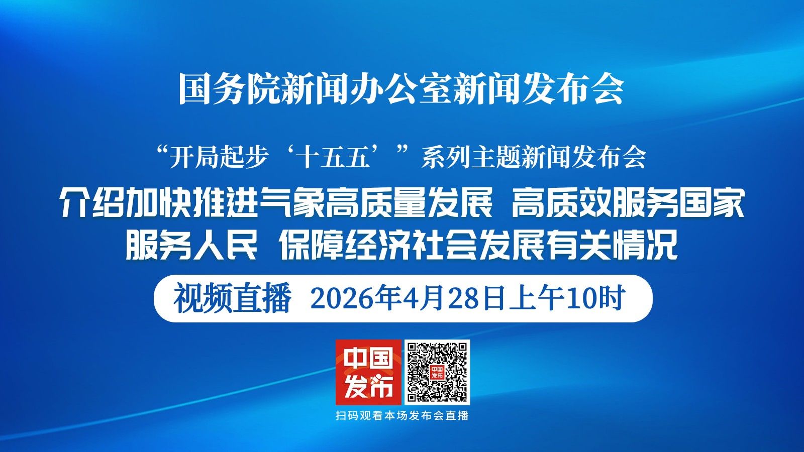 国务院新闻办公室将于2026年4月28日(星期二)上午10时举行“开局起步‘十五五’”系列主题新闻发布会,请中国气象局局长陈振林介绍加快推进气象高质量发展、高质效服务国家服务人民、保障经济社会发展有关情况,并答记者问。