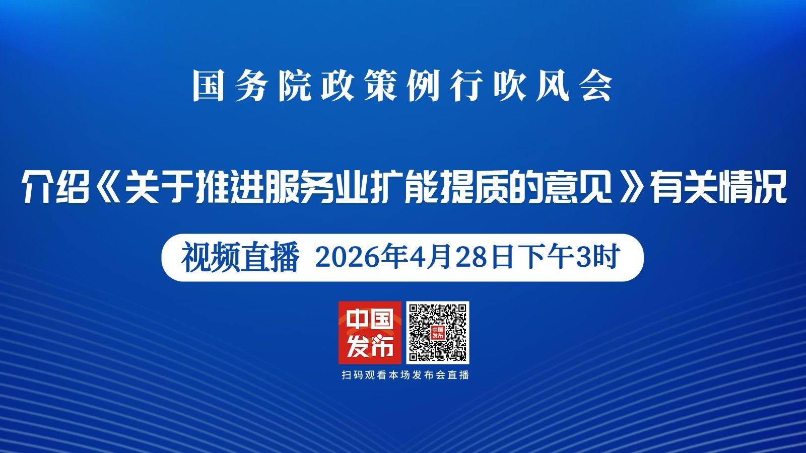 国务院新闻办公室将于2026年4月28日(星期二)下午3时举行国务院政策例行吹风会,请国家发展和改革委员会副主任沈竹林,商务部部长助理张力,文化和旅游部副部长高政,国家市场监督管理总局副局长、国家标准化管理委员会主任邓志勇和工业和信息化部有关负责人介绍《关于推进服务业扩能提质的意见》有关情况,并答记者问。